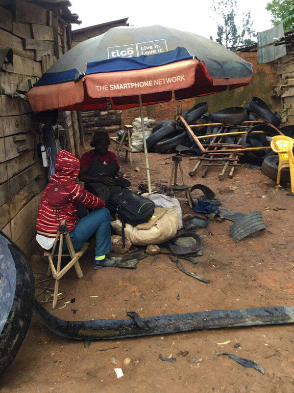 Oft sind dort auch Menschen zu finden, die auf dem Boden sitzend Schuhe reparieren, z.B. aus alten Autoreifen. Es gibt hier keine Sachen, die zu alt sind um nicht repariert oder anders verwendet zu werden, sagt Fulgence. Das glaube ich ihm sofort.